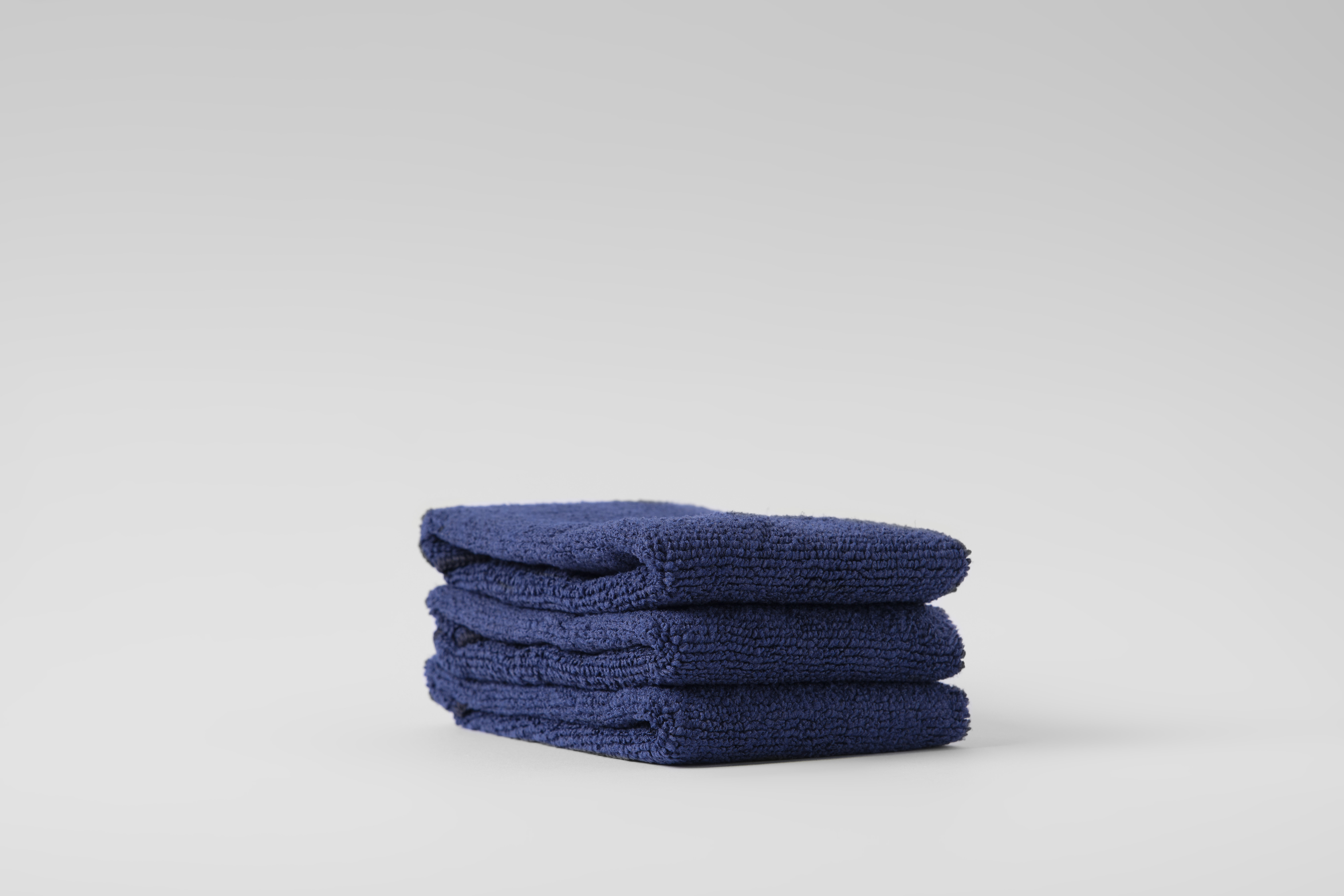 Drei gestapelte, blaue Mikrofasertücher von Beyer & Söhne. Sanfte, hochwertige Textilien für eine gründliche und schonende Hautreinigung.